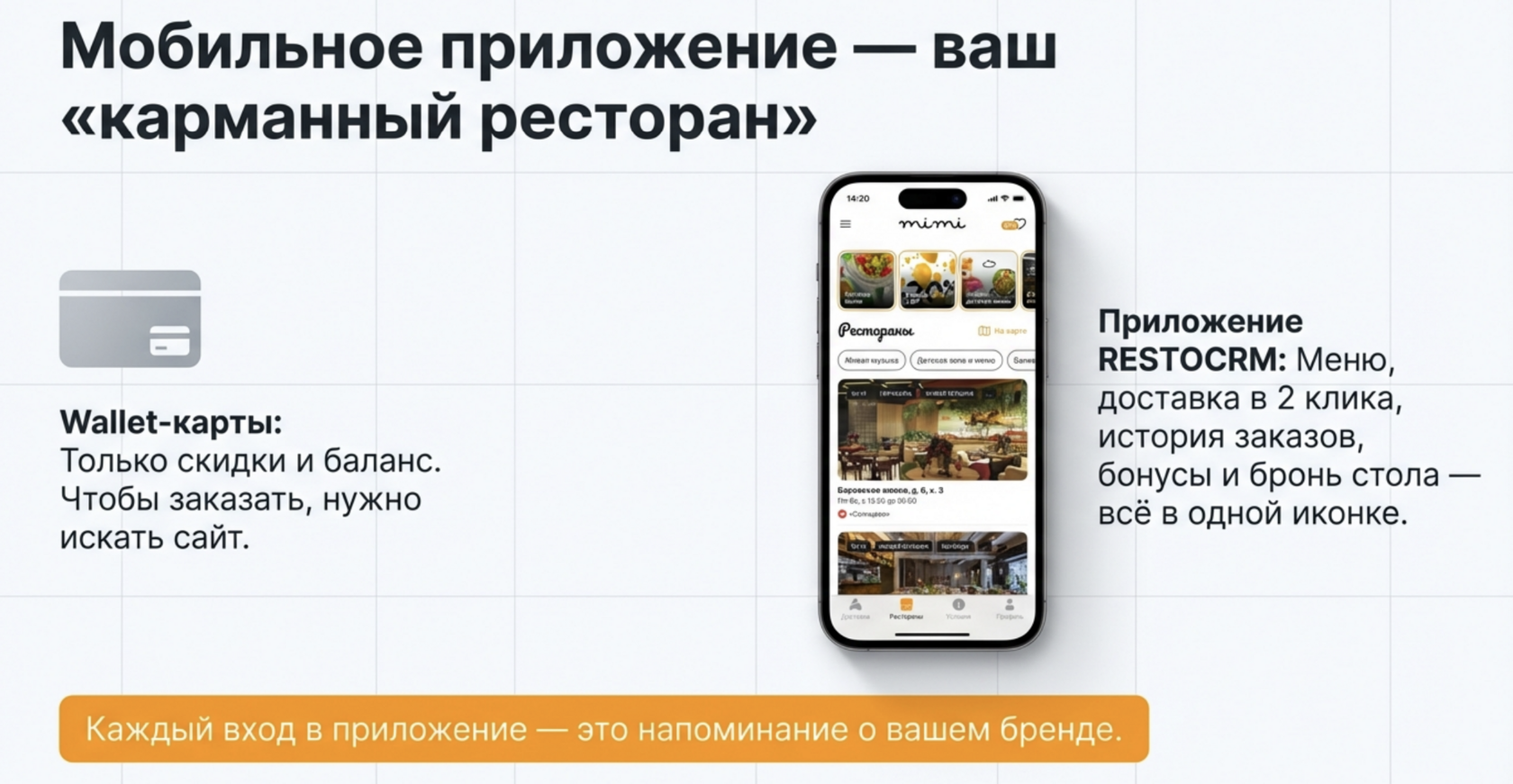 Гость больше не думает, где у него бонусы, где доставка, а где меню. У него один привычный инструмент — мобильное приложение ресторана.