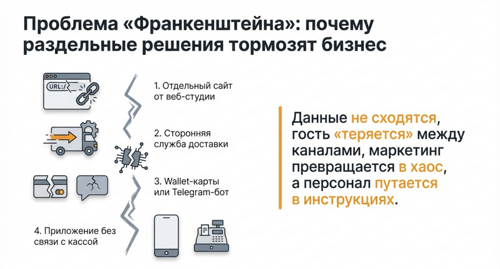 Отдельный сайт, отдельная доставка, отдельная программа лояльности, отдельные карты или Telegram-бот — на старте это кажется рабочим вариантом. Но по мере роста бизнеса такие решения начинают мешать: данные не сходятся, гость теряется между каналами, персоналу сложно объяснить, «где и как что работает», а маркетинг превращается в набор разрозненных действий.
